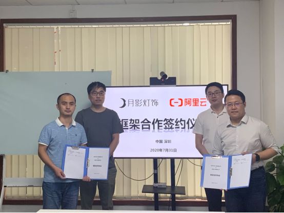 2020年7月31日,月影灯饰与阿里云框架合作协议签署仪式在深圳宝安智谷月影灯饰总部成功举行。双方将在数智化转型新时代,整合各领域资源,展开全方位合作。阿里云智能新零售美家行业区域负责人刘嘉奇、阿里云智能新零售美家行业首席架构师陆春龙、月影灯饰照明事业部总监朱小伟、月影灯饰财务总监李佳、月影灯饰流程信息中心总监袁文涛等双方领导代表共同出席合作协议签署仪式。