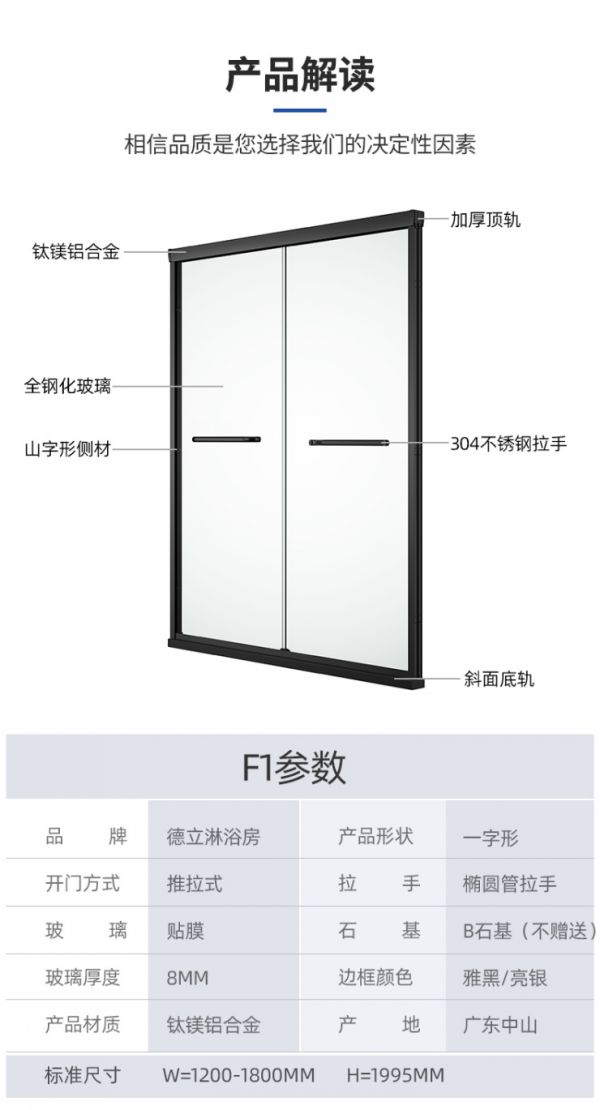 德立轻定制系列F1(平移门淋浴房),在标准产品基础上,根据个人使用习惯定制适合自己使用习惯的淋浴房,介于标准产品与全定制之间,效率更高,价格更低,在一定的范围内进行“微调”,可以按套购买,无需烧脑计价,低至1999元就能享受定制淋浴房新体验。
