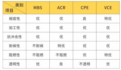 通过表1可以看到,VCE树脂比MBS耐候、比ACR阻燃、比CPE透明,同时还具备绝缘、耐腐蚀的特性,因此综合性能更加优越。