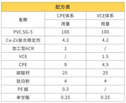 目前国内常见的PVC型材配方大多采用CPE体系,碳酸钙填充量在10-40份,CPE用量8-10份。由于VCE树脂的结构特点,因此应用于PVC型材中可以替代配方里的加工型ACR并显著降低CPE的使用量,生产工艺参数与原有CPE体系基本保持一致。