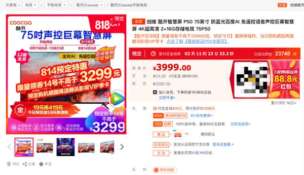第二款:智慧巨幕高配低价 酷开声控智慧屏 P50 75”