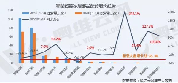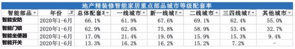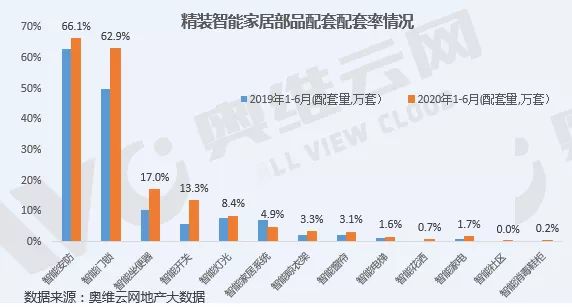 从精装智能家居整体配套率来看,2020年上半年绝大部分的智能家居的配套率较去年同期有明显的增长。