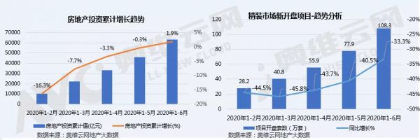 根据国家统计局最新数据显示,2020年上半年国内生产总值累计增长了3.2%,其中房地产业增长达4.1%,而房地产投资累计增长趋势已经从2020年1-2月降幅16.3%,慢慢的缩窄直至增长为+1.9个百分点。随着经济的逐渐复苏,受疫情影响延期开盘的项目正在陆续释放,精装修新开盘套数的同比增长也在逐渐的缩窄。根据奥维云网地产大数据2020年300城+调研数据显示,2020年1-6月精装楼盘新开盘项目套数为108.34万套,同比下滑幅度已经从-44.5%慢慢攀升,目前的同比降幅维持在-33.3%。
