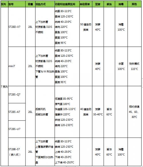第二是凯度台式蒸烤一体机7系列的对比:目前有6种款式,分别是:X7 mini7、Q7、A7、U7、S7。