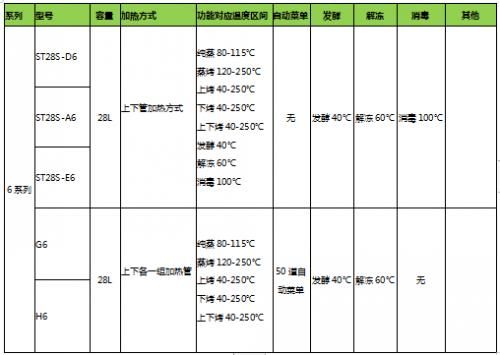 首先是凯度台式蒸烤一体机6系列的对比:目前共有5种款式,分别是D6、A6、E6、G6、H6。他们都是28L的容量。具体对比如下:
