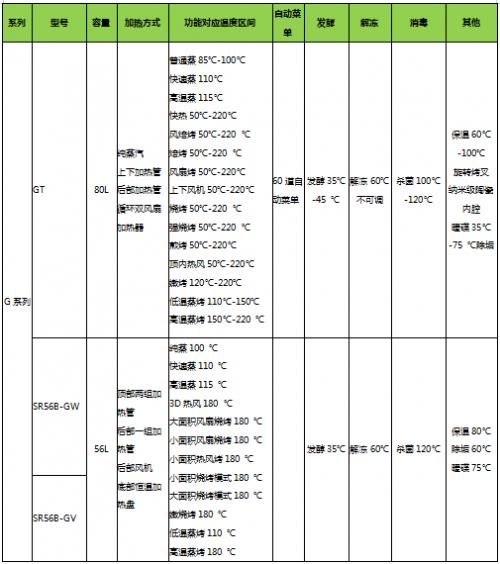 第三就是凯度嵌入式蒸烤一体机的G系列,分别是:GT、GW、GV同样是高端配置系列。具体的参数对比如下: