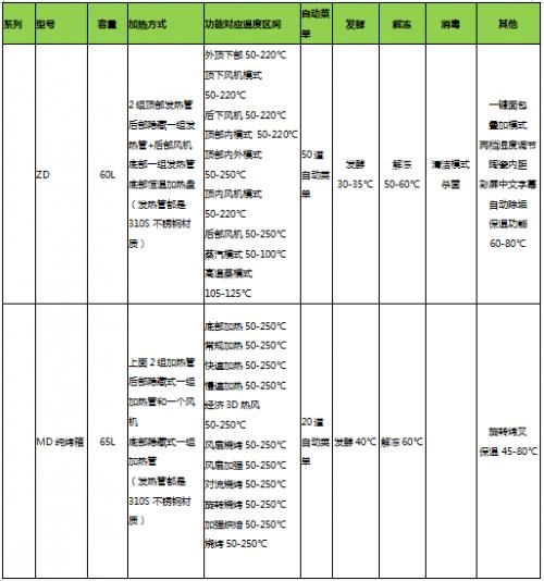 最后的两款的名字是ZD和MD。ZD特殊的地方在于使用的是易清洁的陶瓷内胆,并且在面板操作上面推出的首款彩屏中文字幕。MD是一款纯烤箱。具体的参数对比如下: