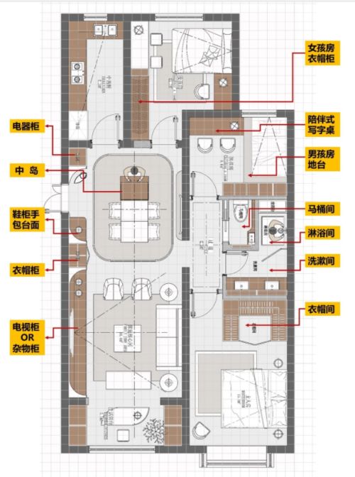 本次设计中,整体方案以轻奢简约的风格为主,在三卧两卫的设计中,设计师充分考虑了人体使用习惯的原则,在做到空间与空间符合人体运动线路的同时,考虑到孩子的成长互动,设计师特意在原有的空间格局上加大了对男女儿童房的公共互动空间的改造。