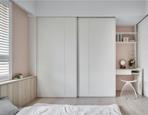 宽大敞亮的衣柜更适合爱美的女孩子,旁边百叶橱窗的设计为这个空间加入了几分光的浪漫美。