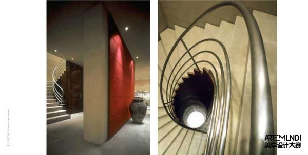 旋转楼梯的四周墙壁上也用了红色的丝绒布,以此为背景,我们在中间放了一个镶嵌着西西里特色布艺的拼花的圆形沙发,不但强调了巴洛克的风格,也让背景与沙发形成了一种强烈的冲击。