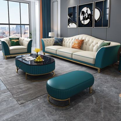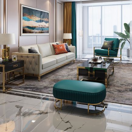 沙发作为客厅中一眼就能看到的家具,其美观度也尤为重要。而弗美嘉住宅家居就有很多美观的沙发,其中最值得一提的就是美式轻奢风真皮沙发。这款沙发的主打色是孔雀蓝,在原有的正蓝色基础上降低明度,营造出深邃的气氛,以传达稳重与成熟,使得客厅更有深度和广度。而且,弗美嘉住宅家具还特别为这套沙发的靠背边做了弧度设计,起伏流畅的弧线凸显出高贵与庄重。此外,沙发拥有光亮质感的皮面还能让整个客厅显露出大气的格调。