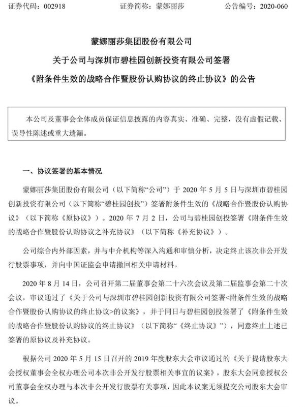 2020年8月14日晚,蒙娜丽莎、帝欧家居分别披露了和碧桂园创投有关的非公开发行股票事项终止的公告。两家公司同一天终止了此前与碧桂园创投签署的股份认购协议。