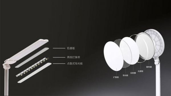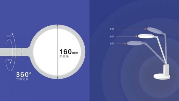 台灯灯头直径160mm,大面罩。导光板通过激光点阵光学设计,侧面光源在面板散射网点折射光线的方向形成面光源,对亮度、均匀度以及炫光作最优化设计,还可对其入光部LED暗区等细节处做调整,台灯发光面积大,亮度柔和,读写视野更开阔。