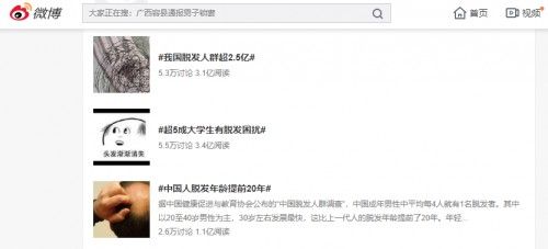 当前,人们由于生活、工作和学习压力增大,再加上焦虑、熬夜等因素的影响,脱发问题日益严重。国家卫健委发布的脱发人群调查显示,我国脱发人群已超2.5亿,平均6个人中就有1个有脱发症状。在微博上,关于脱发的话题阅读量动辄上亿,这也从侧面表明人们对脱发问题的广泛关注。