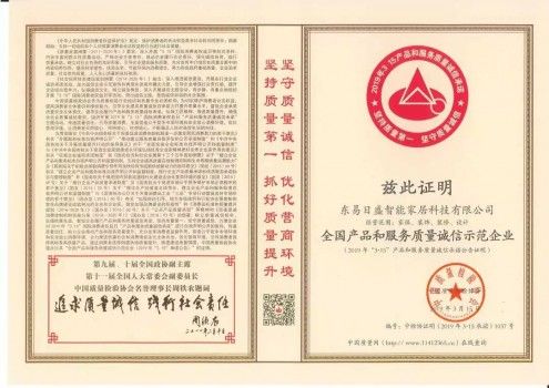 2017年,东易日盛在国家企业诚信评比中,荣获『全国产品和服务质量诚信示范企业』。