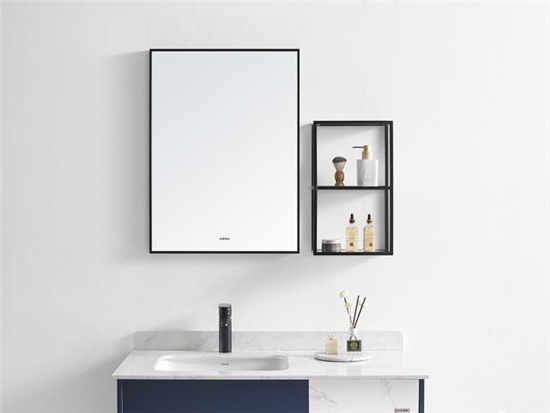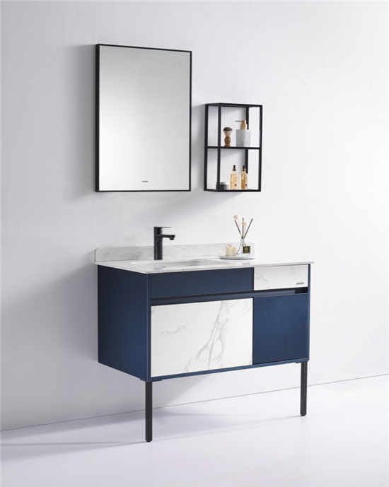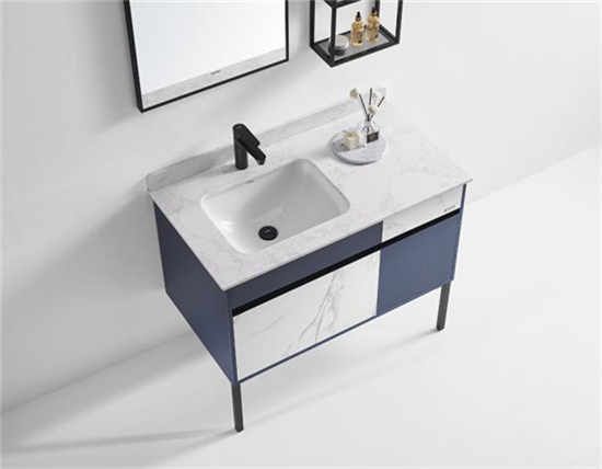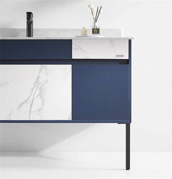 安华卫浴N1D10T63-B布鲁斯系列浴室柜,静谧的绅士蓝与大理石纹路的不对称设计,创造出深邃优雅的特质,黑色柜脚与置物架为整体带来沉静、高雅的感觉。