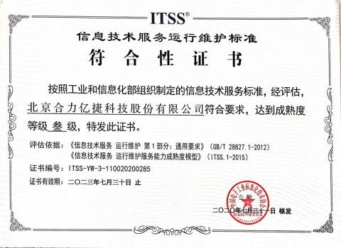合力亿捷获ITSS运行维护服务能力成熟度三级认证
