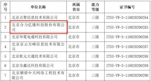 近日,中国电子工业标准化技术协会信息技术服务分会(简称ITSS)发布公告,公布了通过运行维护服务能力成熟度符合性的企业名单。其中,北京合力亿捷科技股份有限公司(简称合力亿捷)凭借系统的运维服务能力管理,完善的人员、过程、技术和资源方面的管理制度,获得信息技术服务“运行维护服务能力成熟度三级”认证。