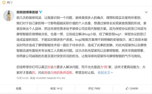 8月18日,作为娱乐圈的话题女王郑1爽再次被送上热搜,而此次则是再次提起8月14日谈及的装修风波。与上次不同的是,郑1爽表示为此前自己的鲁莽行为致歉,希望及时止损,并称赞两家公司诚恳的态度及面对突发状况的担当。