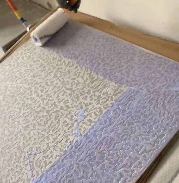 师傅用毛巾沾取少量清水,轻轻擦拭瓷砖背面灰尘、油污、脱模剂等杂质;干透无明水后,师傅用长毛滚筒和毛刷将背胶均匀涂在瓷砖背面;