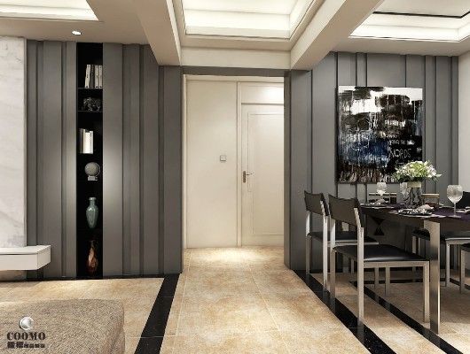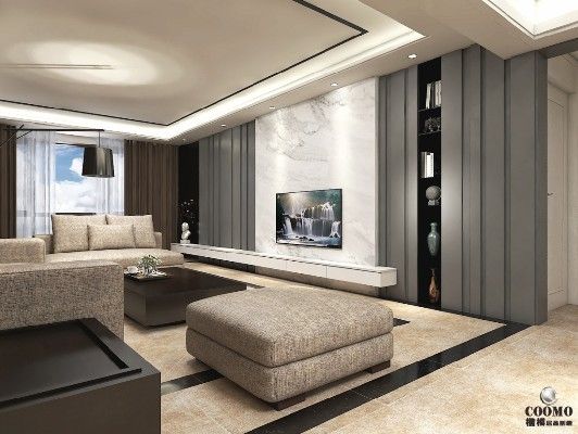 现代极简与东方素韵的糅合相衬。柔软舒适的沙发配上素雅的护墙板,大理石h花纹装点清雅气质,半隐半现的陈列柜像一滴古典的浓墨晕开,空间的韵律感、层次感得以丰富。