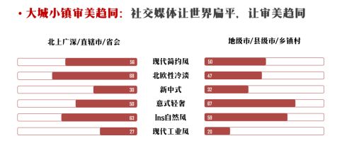 在白皮书中的家居风格偏好中可以看出,现代简约风和Ins自然风的热门程度不相上下。随着社交媒体的普及,北上广深这样的大城市与地级市县级市这样的三四线城市中的年轻人,对于“美”的偏好都很类似,56%的大城市和50%的小城市年轻人都比较倾向现代简约的家居审美风格。