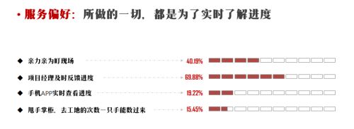 根据白皮书数据显示,虽然有很高比例的消费者希望能当甩手掌柜,啥都不管只用领包入住,但是现实是只有15.45%的人真正当了甩手掌柜,有40.19%的人会亲力亲为盯现场。这样的数据差异源自定价不透明、沟通不畅、偷工减料等问题带来的困扰。