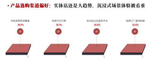 虽然当今电商非常发达,直播、购物APP已经渗透到生活的每个角落,但对于家居产品这样的大件消费品,更多的消费者还是选择到线下进行购物体验。其中有69.17%的消费者曾经到传统家居卖场选购家居产品,55.43%的消费者曾经直接到工厂选购心仪的家居产品,只有36.71%的消费者在电商平台买过家居类产品。