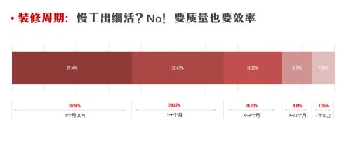 65.56%的消费者只能接受装修周期在半年以内。现在忙碌的年轻人,时间金贵,做任何事情都讲求速战速决,装修也不例外。更何况漫长的装修周期中会有无数的问题找上门,最好能够高效地让他们拎包入住,让他们舒服地宅家撸猫追剧,享受快乐肥宅生活。