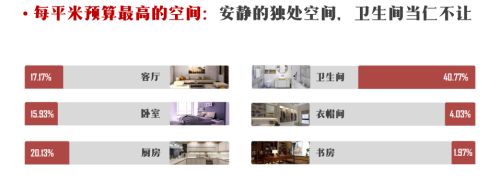从单位面积的花费来看,卫生间稳居第一,有40.77%的家庭每平米花费最多的空间是卫生间,紧随其后的是厨房,有20.13%。而客厅和卧室的每平米花费分别为17.17%和15.93%,这一比例,与随机街采中的反映出的花费比例十分吻合。
