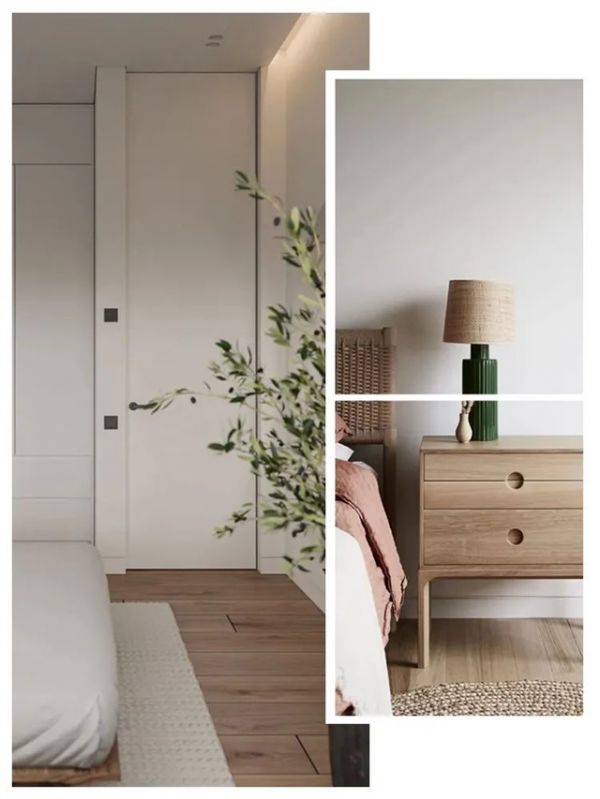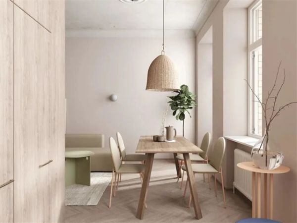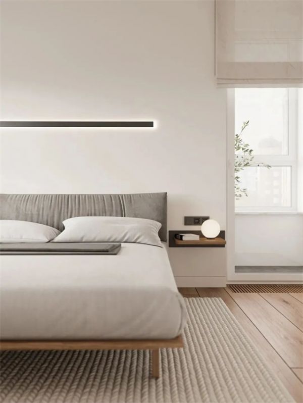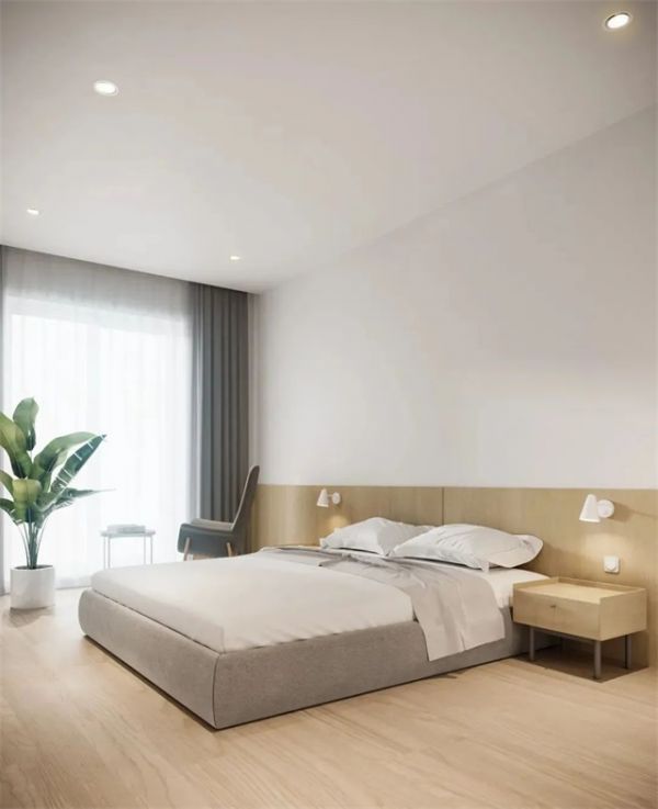 在极简北欧的卧室里,米色和原木效果被应用在整个家庭中,以在整个家庭中获得平滑而有凝聚力的氛围。一些绿植被带入家中,为极简的家增添更多生机。