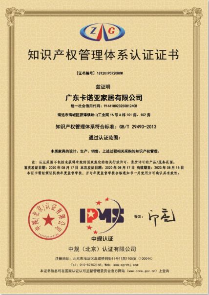 近日,经层层严格的内审、外审,作为高新技术企业的卡诺亚,顺利通过中规(北京)认证有限公司的审核,其知识产权管理体系完全符合国家关于企业知识产权管理规范的要求。获此认证,表明卡诺亚在推进公司知识产权管理规范化方面获得重要认可,综合竞争力进一步提升,对企业健康可持续发展带来深远影响,也为中国定制家居行业推进知识产权管理体系建设树立了标杆。
