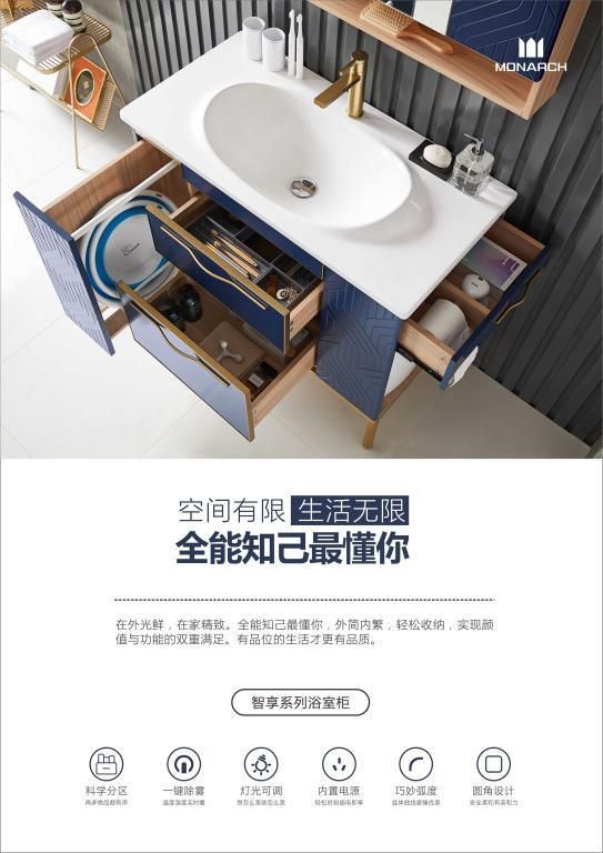 弧度设计的面盆是这款浴室柜的一大亮点,能够确保洗漱时水花不轻易弄湿台面;智能则体现在镜柜的LED无影灯光,垂直均匀光线,能够聚焦肌肤细节,方便妆发,此外镜柜还有显示时间、温度、湿度等辅助功能,方便随时掌握室内温湿度变化。更为亮眼的是,本款浴室柜将功能分区做到了极致,洗漱用品、护肤化妆品、女性饰品、男性剃须刀等每件物品都有归属位置;右侧镜柜上贴心的则设计了插座,方便联接吹风机等小家电,马桶功能区侧边柜的设置,方便人们在如厕的时候,伸手就能拿取手机、厕纸、杂志、卫生棉等等小物件。