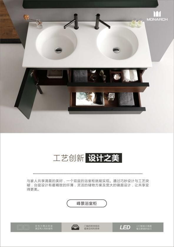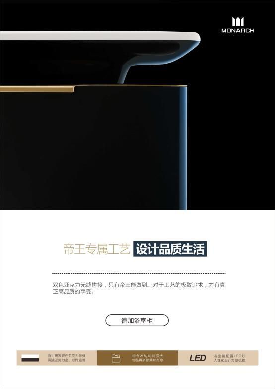 本款新品运用了帝王洁具全新自主研发工艺——双色亚克力无缝拼接技术,可将两种颜色的亚克力无缝拼接在一起,对时尚、质感有追求的消费者,选择这款绝对不会出错。超大水容量台盆和大台面设计,完全能满足日常洗漱使用,亚克力盆四周还设计了加厚挡水功能,既能防止水珠浸湿柜体,又能避免洗脸时候的水珠滴出盆外,搭配一面纯平智能大镜面,灯光、时间、温度、湿度等功能样样齐全,妥妥的实用派选手。