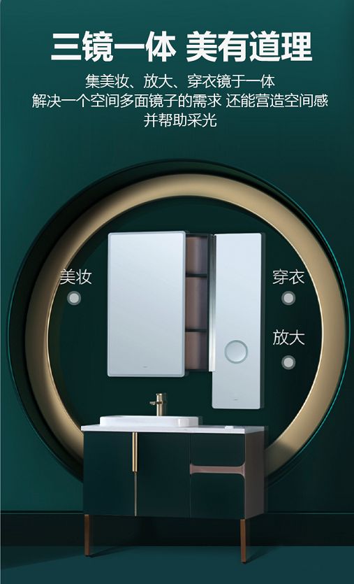如果喜欢轻奢范儿,那这款浴室柜绝对可以满足很多爱美人士的需求——穿衣镜、智能镜、放大镜,三镜一体是本款浴室柜最大的亮点。地柜和镜柜组合储物,给了浴室足够的收纳空间,柜体内部空间也有明确的功能分割,分类收纳更加科学,即便是不喜欢收纳的人也不用再担心凌乱。如果家里装修略带Art Deco的味道,搭配这款墨绿色的浴室柜一定很好看!