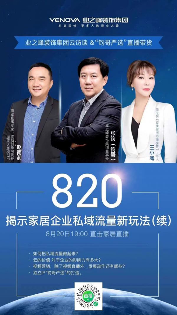 8月20日晚19点,业之峰装饰集团云访谈&“钧哥严选”直播带货活动隆重举行,业之峰装饰集团董事长张钧(钧哥),原央视《交换空间·空间榜样》主持人王小骞,商业直播专家、收稻创新院院长赵雨润一起相聚云上,共话家居直播,揭示了家居企业私域流量的新玩法。