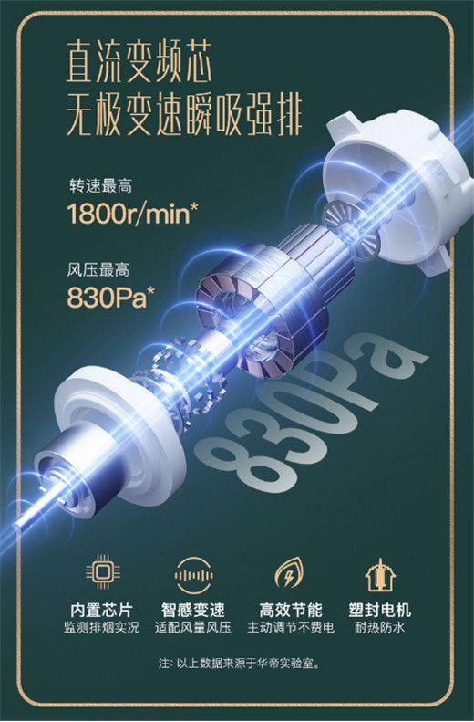 这一切源于华帝油烟机i11150具有一颗最强大的内芯——新一代直流变频电机。直流变频电机具有极速智能变频油烟吸排的优势,正如智能变频空调一样,能够根据油烟实况,自适应风量和风压,低速静排和高速强排随机应变,智感恒吸功能,无需人手调节油烟机,正如机器挂上了自动挡一样,让机器调节不必再烦恼于“选择纠结症”。