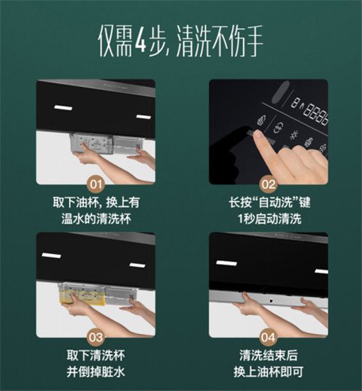 热水自动洗功能,是华帝油烟机的独特功能,更是购买华帝油烟机产品的消费者福音。华帝油烟机i11150机器自动洗操作程序十分简单,只需要简单的四步即可完成:首先取下油杯,换上盛满清水的清洁杯;然后长按“清洗键”,启动自动洗程序,机器即通过高温预热、强力冲刷和高速甩油烘干等流程进行自动洗;接下来换清洁杯,重新装上油杯即可。