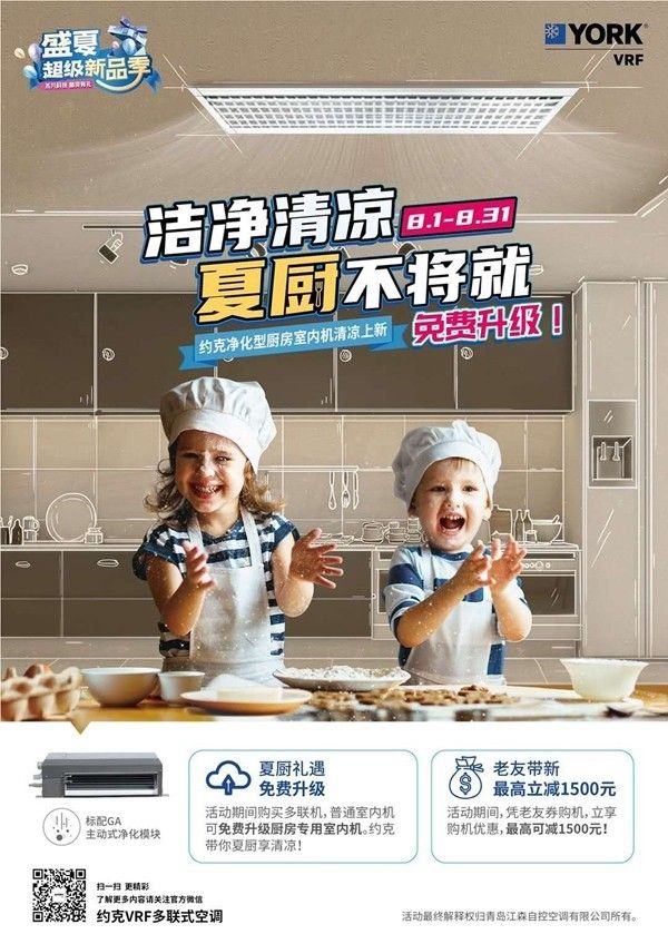 家里可以清清爽爽,我们的回馈活动依然像室外的艳阳一样火热!8月1日-8月31日,购买约克多联机、普通室内机可免费升级厨房专用室内机。凭老友券购机,立享购机优惠,最高可减1500元!