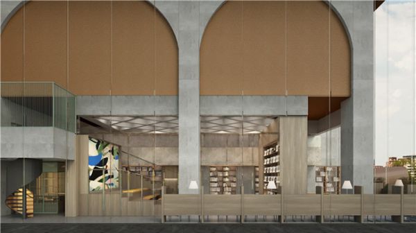 整栋建筑的外立面以古长安军事防御设施“瓮城”、古罗马城的“门洞”为设计原型,呈现极具历史感的“浸入”体验。正门由东入口进入,经由东西向动线延伸,东部入口较窄,西部入口较开阔,呈现一个新文化空间边界的建立与消融的动态过程。历史性的穿越与回溯,对东西方世界的洞察,对未来的敬畏展望,通过共通的设计语言相遇,在这个空间形成了呼应。而当我们逐渐进入内部,重复出现的挑高拱形门廊、斗形天花也不断提醒我们其中的建筑隐喻,“拱形”代表殿堂、知识的入口,“斗形”则代表着交汇、融合。古今穿越的自由感,身处知识殿堂的神圣感,让我们得以暂别外部世界。