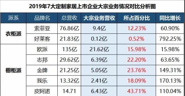 笔者经过数据分析发现,不止是好莱客,橱柜派企业与衣柜派企业之间在业绩增长上的差距,也与它们的大宗业务有一定关系。