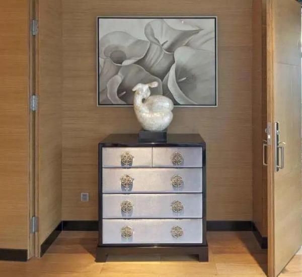 玄关是一个家庭的咽喉之地,所以在玄关的斗柜摆放也对玄关风水的影响至关重要。玄关设置需要光亮、通透,所以斗柜摆放时最好不要放在正中位置,避免影响到玄关的“气流”流通,同时应搁置门厅的右侧为佳。