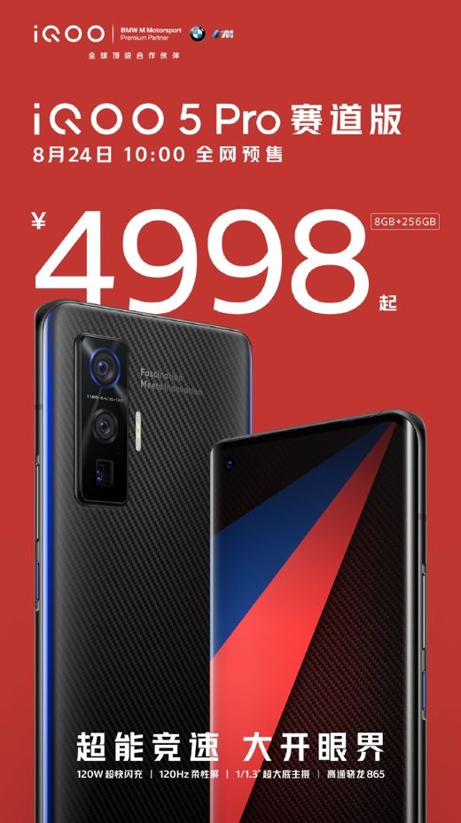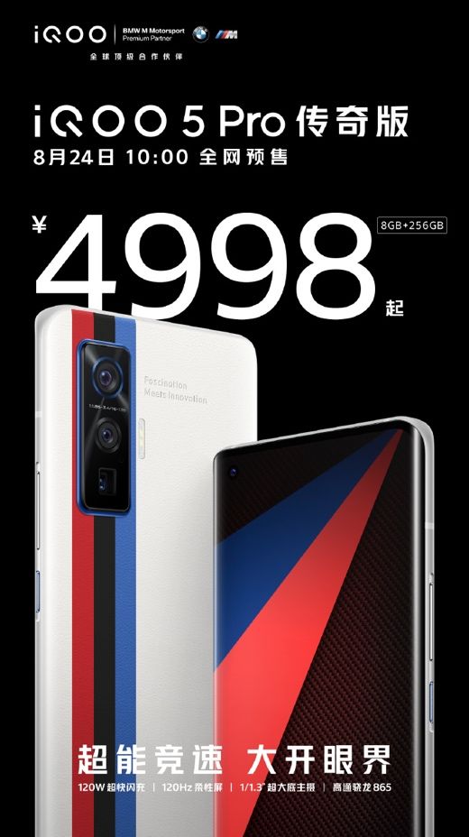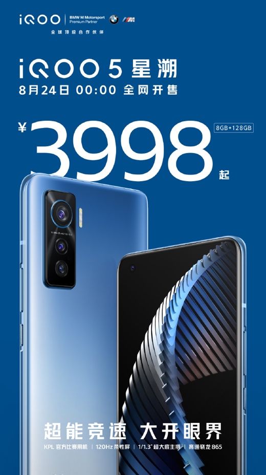 iQOO5已在vivo官网、京东、天猫、苏宁易购vivo手机官方旗舰店正式发售,现在购买享24期免息分期、赠XE710耳机、半年碎屏宝和半年延保、以旧换新最高返3030元等多重购机权益。同时iQOO5Pro也于8月24日10:00正式开启预售,感兴趣的小伙伴不要犹豫,赶紧下手吧!