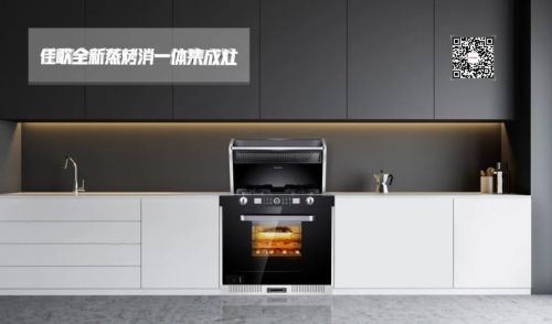 佳歌H6ZK蒸烤消一体集成灶专业级灶具、烟机、蒸箱、烤箱、消毒柜五合一,高端游艇轮廓侧面造型,搭配深蓝色科技感十足长条氛围灯,高颜值外观+实力派表现,吸引参观者咨询试用!