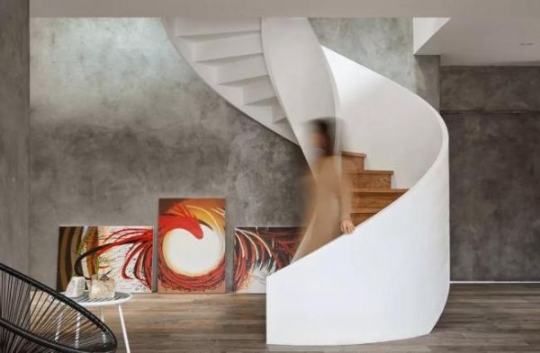 高敞的空间中,墙面、天花、地板几乎完全留白,线条、轮廓极致干净简练;进门处大空间的白色旋转楼梯造型流畅,向上延伸的姿态既增添了建筑的尺度感,亦扮演起面与面之间的媒介物,交织出极富层次的空间美感。