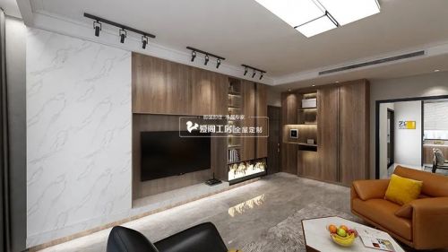 电视背景墙使用了石英石与木色的搭配结合,营造了的层次感,让人耳目一新,在视觉效果上就显得格外舒服。并且还省去了购买电视柜的需求,在省去一笔花销的同时使其灵动而不显累赘。木色虽然没有纯色那么干净,但是是极其自然的,显露着纯净安宁。再在其中加入黑色、爱马仕橙、大理石材质等家具提升空间的柔和度和温度,营造出一种温柔的香醇感,极大提升了入住者的体验。