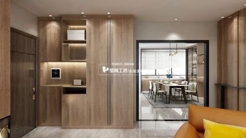 入户处宽敞而通透,靠墙打造了一款个性化十足的鞋柜,将空间利用率增至最高,却又保留了新意十足的外观,使之成为入户的亮点。整体选取的木色是非常贴近大自然的。试想一开门就看到如此亲切的颜色,就如同在进门的那一刻收到了一个温暖而有力的拥抱一样,让你卸下满身的疲惫。