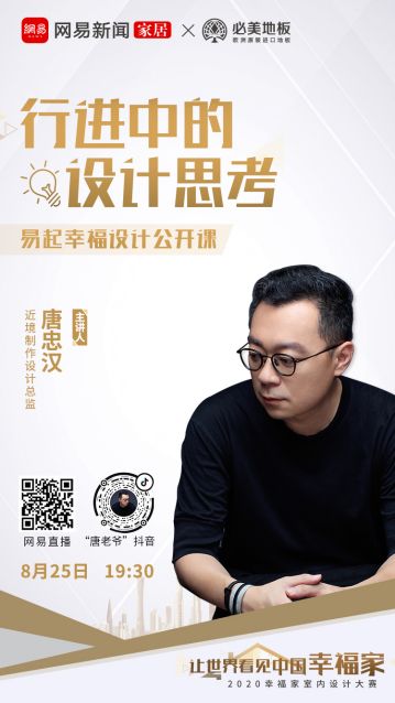 2020必美地板&网易幸福家设计大赛正火热进行中,导师唐忠汉将加入“易起幸福”设计公开课,在七夕节直播开课。8月25日晚上7:30,唐忠汉将在其个人抖音账号“唐老爺”、网易直播间带来以“行进中的设计思考”主题分享,和青年设计师朋友们来一场云约会,以设计为名,畅谈爱与幸福。