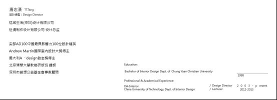 唐忠汉,中国台湾知名室内设计师,近境制作设计有限公司设计总监。他主张透过室内建筑的方式,体验空间、光影、材质、细节,透过以人为本的思考,探索现代住宅的生活方式,回归真实的需要。提升心理仪式性的转换,让住宅不仅是满足基本的需求,而是到达体验的感受,让我们所看到的不仅是设计,而是对于生活的深刻体验。