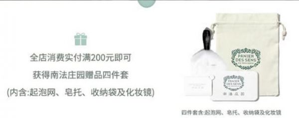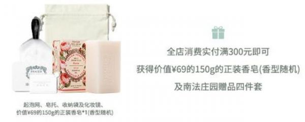 除了礼盒之外,P.D.S七夕个护品类优惠产品众多,七夕活动期间,南法庄园邀您七夕共享好礼。全店消费实付满200元即可获得南法庄园赠品四件套(内含:起泡网、皂托、收纳袋及化妆镜);全店消费实付满300元即可获得价值¥69的150g的正装香皂(香型随机)及南法庄园赠品四件套。礼享七夕,秒懂所爱,P.D.S万千心动好礼挑不够,助力爱情火速升温。